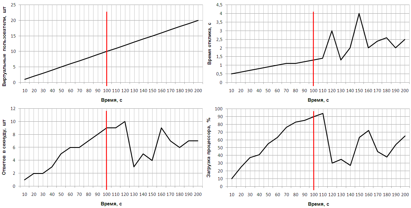 На рисунке 1 представлены графики изменения вышеперечисленных показателей при проведении теста определения максимальных возможностей некоторой гипотетической идеальной системы. Следует отметить, что в реальности такие системы не встречаются, однако результаты данного виртуального эксперимента могут служить отправной точкой при анализе результатов реальных экспериментов.